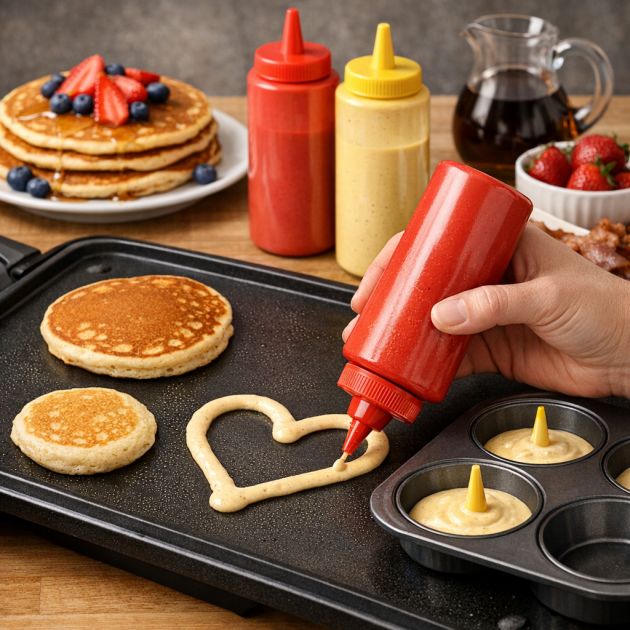 Transform your breakfast routine by repurposing empty condiment bottles as batter dispensers. Simply clean the bottle thoroughly, ensuring all ketchup or mustard residue is removed. Once dry, fill the bottle with your favorite pancake or waffle batter. The squeeze top allows for precise control, making it easy to create fun shapes or pancakes of consistent size.