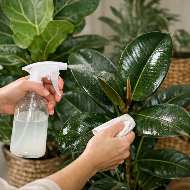 For a natural leaf shine spray, mix 1 cup of water with 1 tablespoon of coconut oil. Shake the bottle well to emulsify the oil. Lightly mist the leaves and gently wipe them with a soft cloth to bring out their natural shine. This method is particularly effective for plants with broad leaves, such as rubber plants and fiddle leaf figs.