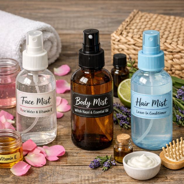 To create a body mist, mix 1 cup of distilled water with 1/4 cup of witch hazel and 15 drops of your favorite essential oil. This can be spritzed onto the skin after a shower for a light, fragrant touch. Hair mists can be made by adding a tablespoon of leave-in conditioner to water, creating a detangling and conditioning spray.