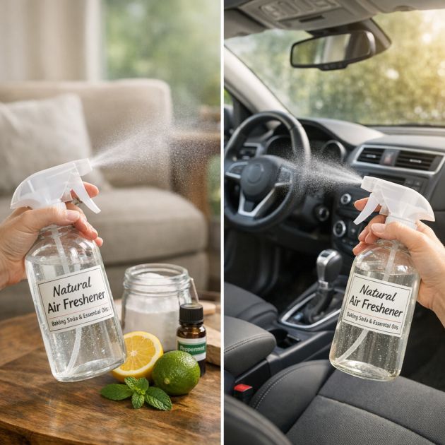 Keep your living spaces and car smelling fresh with DIY deodorizers. Fill a spray bottle with 1 cup of water, 1 tablespoon of baking soda, and 10-15 drops of essential oils like peppermint or citrus. Shake well to dissolve the baking soda.